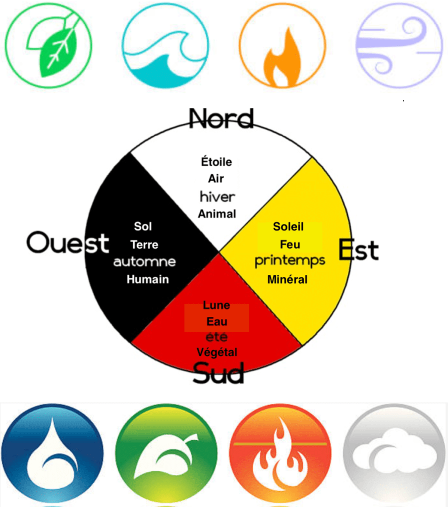 1. Présenter l’artiste et le projet. Consulter le document sur la roue de médecine (sur le TBI). Qu’est-ce qu’une roue de médecine ? La roue de médecine est un symbole spirituel permettant une compréhension cyclique du monde par la relation entre les quatre éléments (feu, eau, terre, air), les quatre directions ou « portes » (est, sud, ouest, nord) et les quatre nations de la terre (jaune, rouge, noire, blanche). Chaque personne, chaque communauté, chaque nation, l’humanité entière se trouve au centre et toutes entretiennent des relations entre elles.