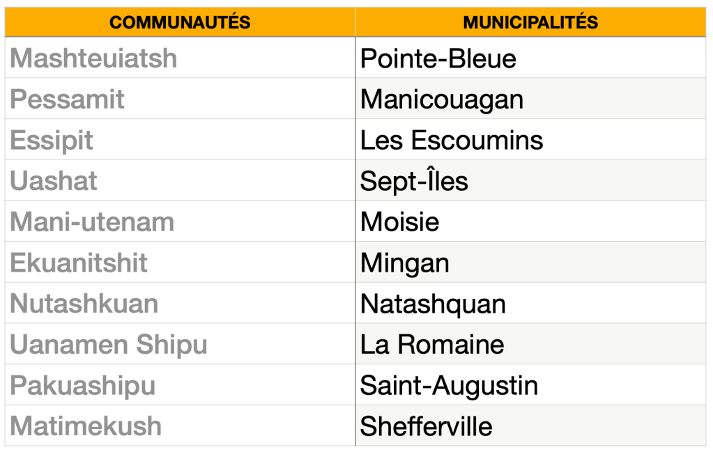 – une photocopie du tableau des communautés innues annexées aux municipalités (1 par table)