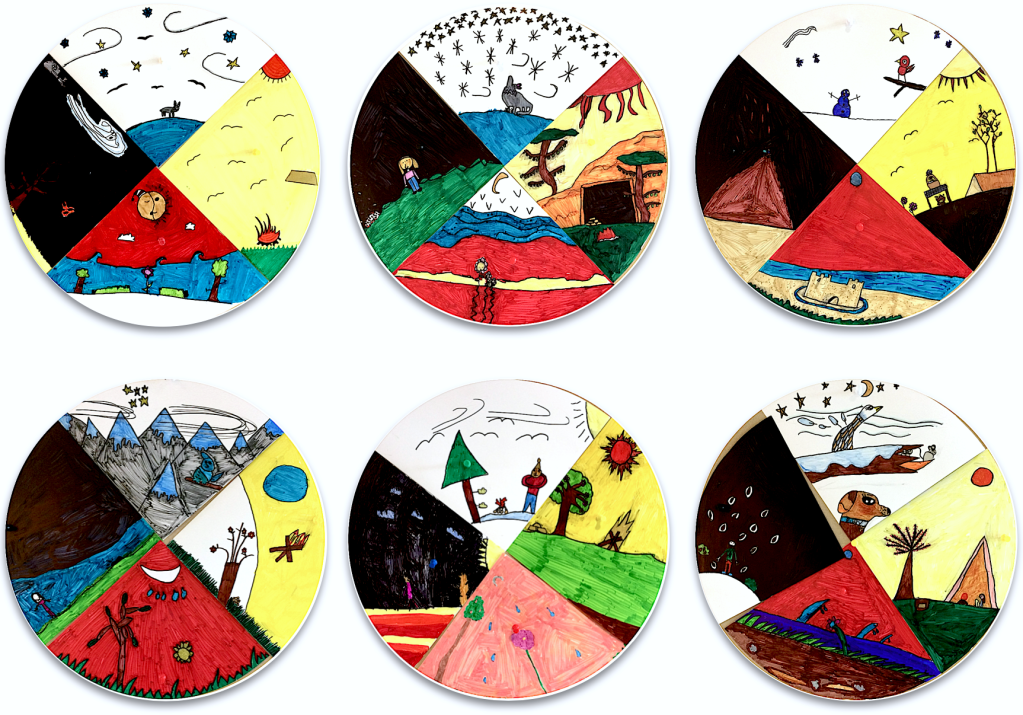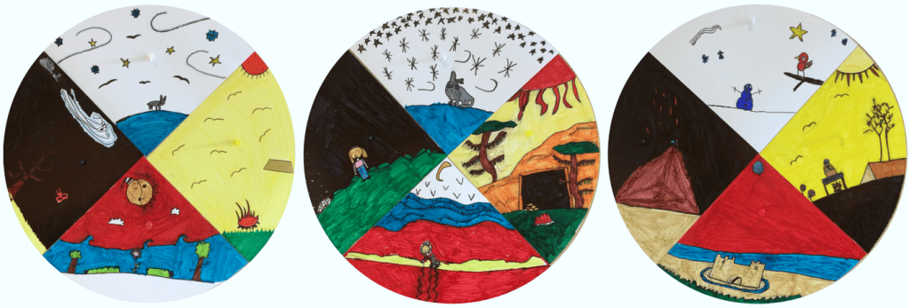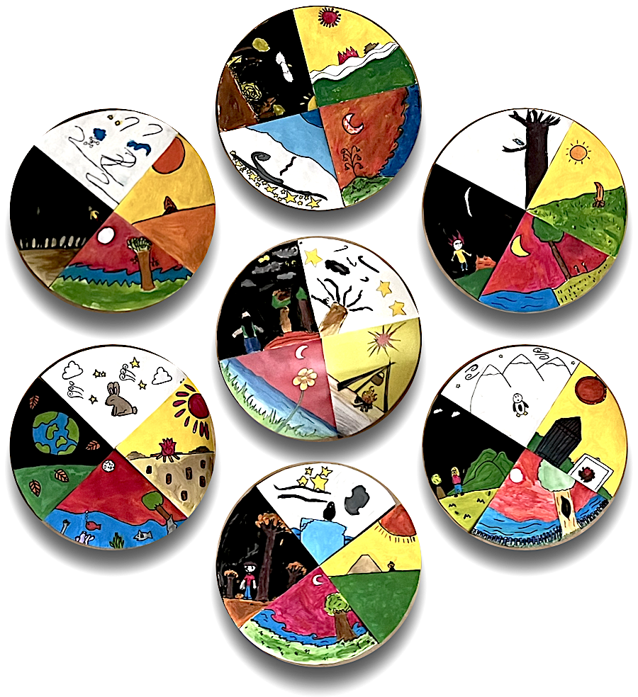 Créer une image inspirée des éléments appartenant à la roue de médecine des Premiers Peuples. Réaliser collectivement une roue de médecine.