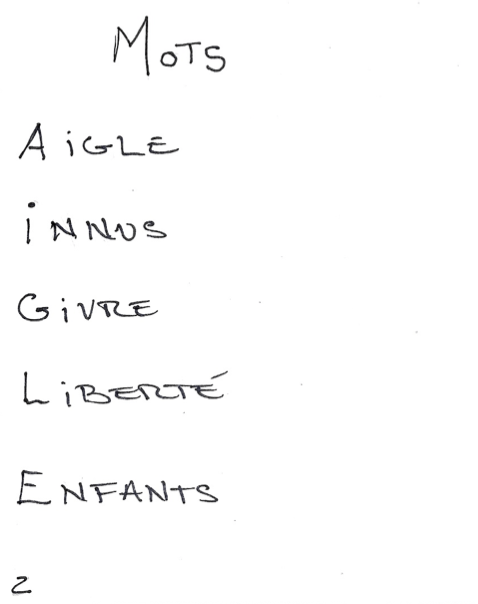 5. Attribuer une lettre à chaque élève (verbalement) : écrire la lettre en haut à droite de la page 2. Écrire le mot en plaçant les lettres l’une sous l’autre (à la verticale). Se référer au tableau et écrire un mot pour chaque lettre (ex. : A : Aigle, I : Innus, G : Givre, L : Liberté, E : Enfants).