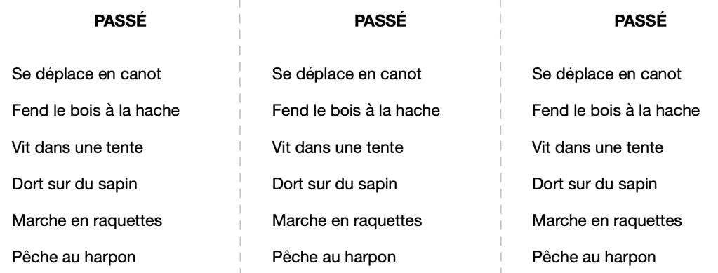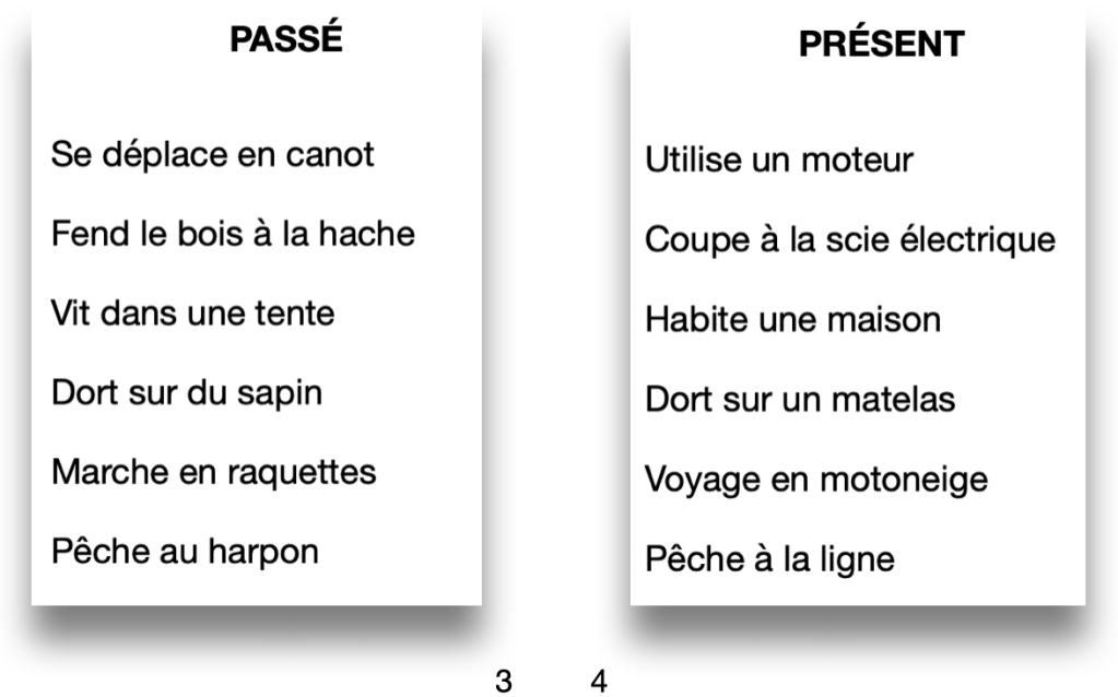 5. Collecter l’information — Explorer et comparer les usages et les coutumes d’autrefois et d’aujourd’hui. Ouvrir une discussion sur les éléments reliés aux changements et écrire au tableau le mot « Passé » et « Présent » et quelques éléments (p. ex. : nomade et sédentaire). Coller une photocopie des éléments reliés au passé, page 3, et une autre des éléments reliés au présent, page 4.