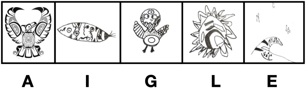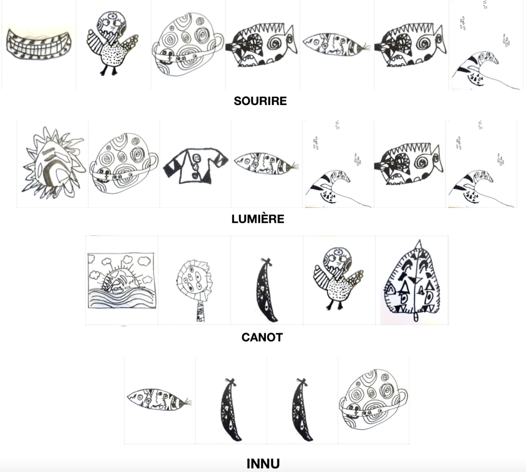 2. Écrire une phrase poétique en utilisant les mots reliés aux pictogrammes réalisés. Par exemple : A : Aigle, I : Innus, G : Givre, L : Liberté, E : Enfants : « La liberté des enfants innus est comme le givre sur le dos de l’aigle. »).