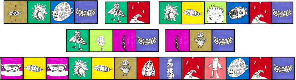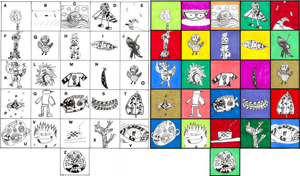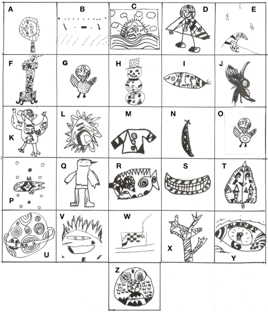 – L’artiste photocopie chaque dessin et reproduit l’alphabet en remplaçant les lettres de chaque mot par les dessins. (Si le nombre d’élèves est inférieur à 26, l’artiste réalise les dessins manquants.) ; il place les dessins de façon à recréer chaque mot sur des bandes de sept cases identiques à celles qui seront données aux élèves.