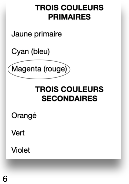 10. Consulter le tableau des couleurs primaire et secondaires (sur le TBI). Quelles sont les trois couleurs primaires ? Jaune, bleu (cyan) et rouge (magenta). Et les trois couleurs secondaires ? Orangé, vert et violet. Coller une photocopie, page 6. Entourer une des six couleurs.