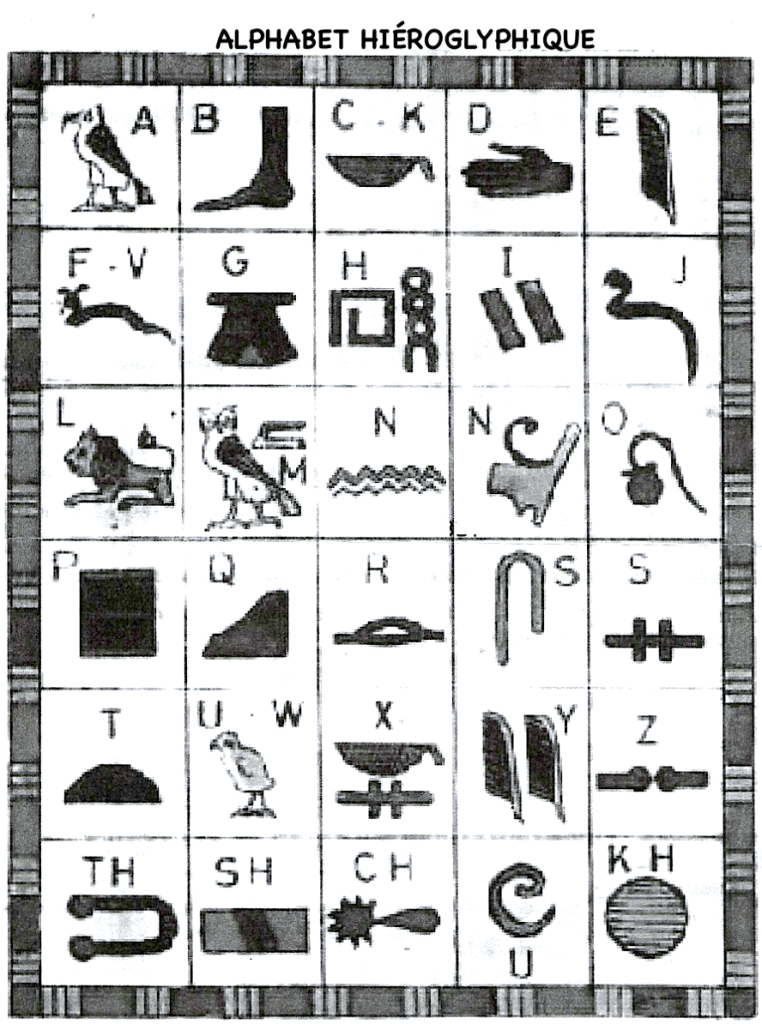 – l’alphabet hiéroglyphique pour consultation.